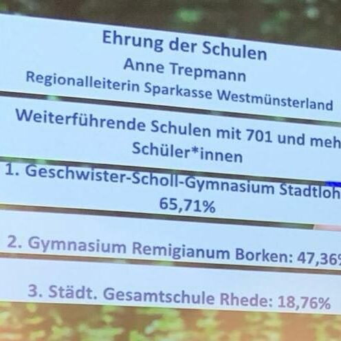 Das GSG hat vergangene Woche Mittwoch (14.05.2025) eine besondere Ehrung für die Anzahl der absolvierten Sportabzeichen im Sportabzeichen-Wettbewerb 2024 erhalten. Wie im Vorjahr belegte das GSG unter den weiterführenden Schulen (mit 701 und mehr Schüler*innen) den ersten Platz! Herzlichen Glückwunsch.