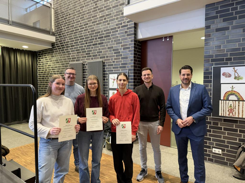 Gleich drei Urkunden konnte Schulleiter Lars Vogel am 29.01.2026 an Schülerinnen und Schüler für die erfolgreiche Teilnahme am Essaywettbewerb 2025 verleihen. Milla Hericks, Zoe Rahms und Johannes Daamen hatten derartig gute Essays vorgelegt, dass sie von der Bezirksregierung Münster mit einer Urkunde ausgezeichnet wurden. Dabei hatten sie ihre Kenntnisse aus dem Philosophieunterricht bei Herrn Gocke und Herrn Marke genutzt, aber auch sehr viel eigene Recherchen, kritische Gedanken und philosophische Überlegungen angestellt. Sie konnten aus vier verschiedenen philosophischen Themen wählen, die zentral von der Website des Wettbewerbs heruntergeladen werden konnten.